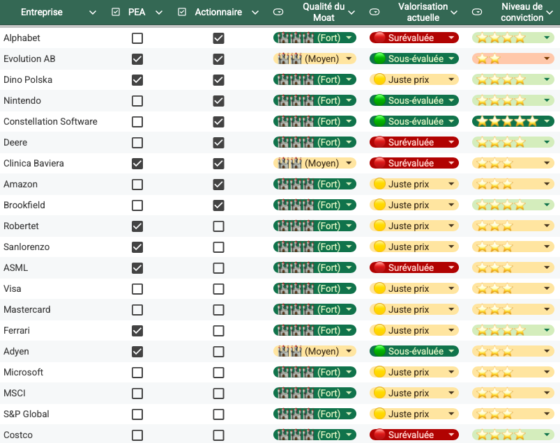 Je vous propose aujourd'hui un tour d'horizon complet de ma watchlist : vous y découvrirez les dossiers que je surveille de prÚs, mon évaluation de leur rempart concurrentiel (Moat) et surtout, mon niveau de conviction pour chacune de ces valeurs.